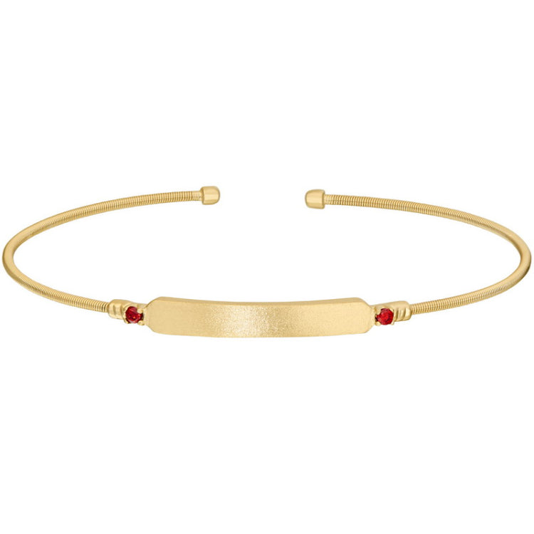 Gold finish sterling silver cable cuff bracelet with name plate and simulated ruby birth gems - july