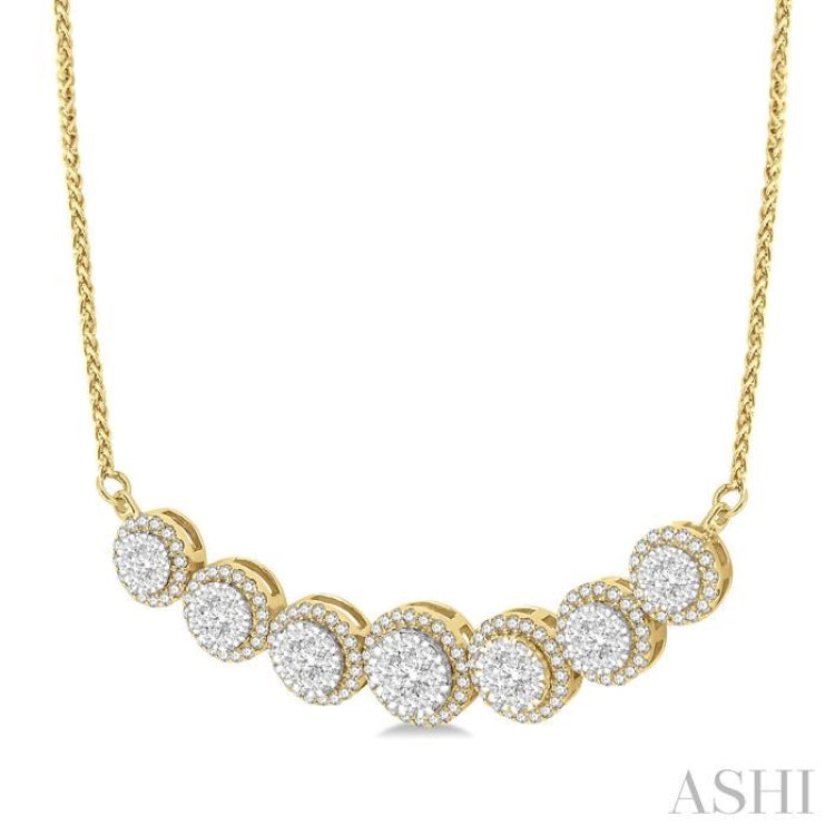 A gorgeous diamond necklace, this draws your attention like every piece of accessory in the Lovebright collection. It features a 7 round mount centerpiece, with a large round mount in the center and three each round mounts flanking it on either side. These mounts also get slightly smaller than their preceding mounts. 63 invisible set round cut diamonds embellish the 14 karat white gold center of these 7 mounts, while 130 micro wall set round cut diamonds form a border around these, on the mounts. A 1.1MM 16-inch wheat chain completes the necklace, which is styled in 14 karat yellow and white gold. Total diamond weight is 1 1/5 Ctw.