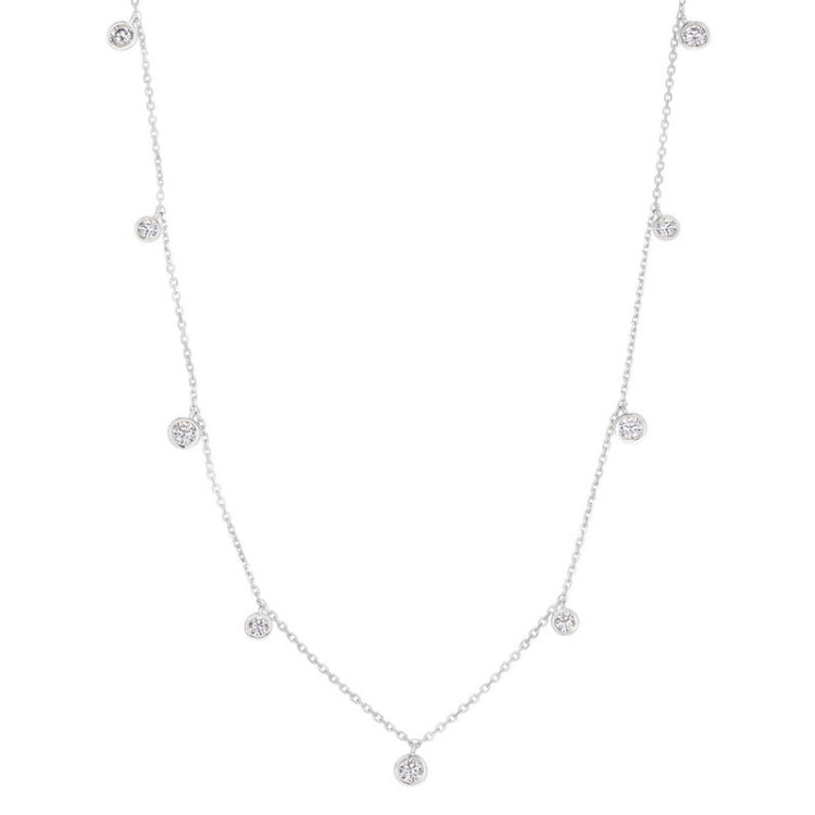 Platinum finish sterling silver station necklace with 9 simulated diamonds on 18"-20" adjustable cable chain