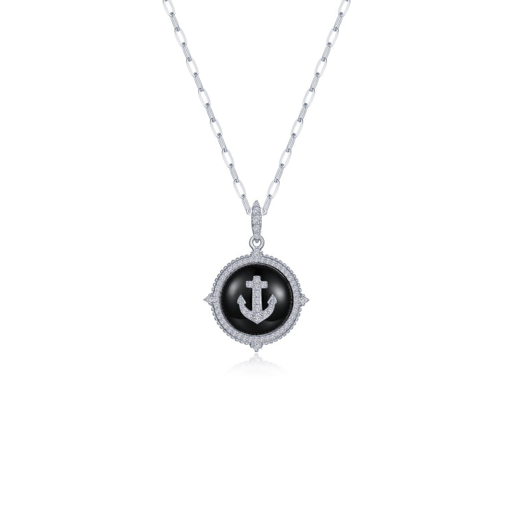 Meaningful and striking. This pendant features a finely crafted anchor set against a bold black onyx backdrop, it symbolizes grounding and the courage to navigate life’s journey. Adorned with sparkling Lassaire simulated diamonds in sterling silver bonded with platinum.
