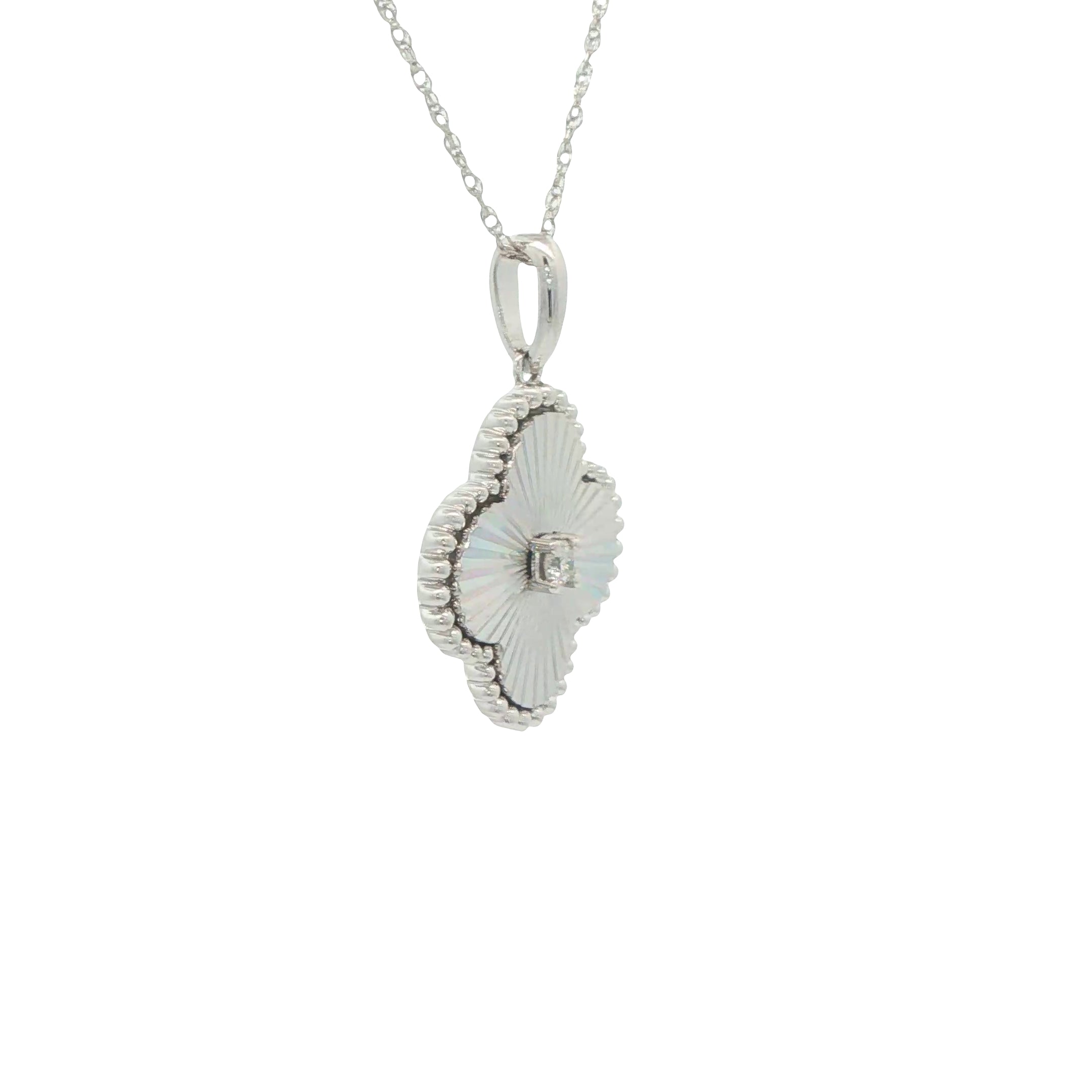 Elevate your collection with this refined white gold charm necklace, showcasing a clover-shaped pendant delicately adorned with a brilliant-cut round diamond. Its understated elegance and timeless design make it an exceptional choice for both everyday wear and special occasions, offering a subtle yet sophisticated sparkle that complements any outfit. Crafted for enduring style, this piece blends classic symbolism with expert craftsmanship.