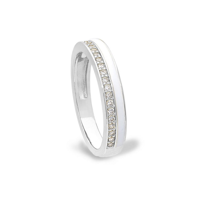 Platinum Finish Sterling Silver Micropave Ring with with White Enamel and Simulated Diamondss