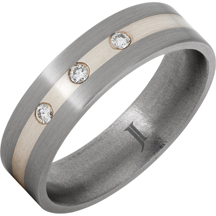 A beautiful statement with diamonds and mixed metals. Ultra-light and strong Aerospace Grade Titanium features three .03R diamonds set in a 2mm sterling silver inlay and given an elegant satin finish. Slimmer 6mm width, available in both men's and women's sizes. Inside rounded Comfort Strong, flexible, and light weight, Titanium is the material of choice for many contemporary rings. Our Aerospace Grade Titanium is 90% pure, the same quality standard required by the aerospace industry for the most demanding applications.