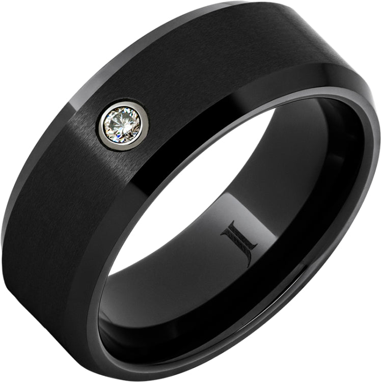 A sophisticated classic that takes it up a notch, this Black Diamond Ceramic ring features a single, .06 carat round cut diamond and satin finish. Polished beveled edges add contrast and beauty. This ring is also available in Serinium® and Rugged Tungsten, and in the popular 6mm width. Men's and women's sizes, inside rounded Comfort Fit.The Tuxedo Collection from Jewelry Innovations features formal, classic designs with eternal appeal. Tuxedo Collection rings are available in Serinium®, Black Diamond Ceramic and Rugged Tungsten.