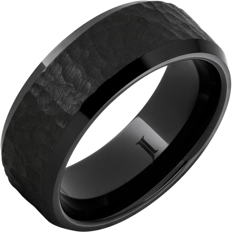 From the Craftsman Collection, a Black Diamond Ceramic ring with our exclusive hand carved Moon Crater Finish. Polished beveled edges provide contrast and elegance. Available in men's and women's sizes, with inside rounded Comfort Fit.Black Diamond Ceramic is a brand of high tech ceramic jewelry that is extremely hard and light weight, resulting in a beautiful and enduring ring. Colored throughout rather than coated, Black Diamond Ceramic will not show the effects of wear.