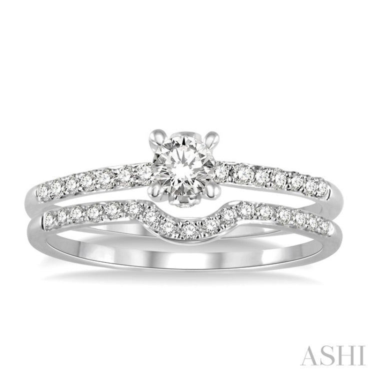 Make her eyes glitter with your intense love and with this captivating Diamond Wedding Set. The engagement ring holds a brilliant 1/5 Ct prong set round cut center stone accentuated by 16 round cut diamonds in elegant pave and bezel setting. The wedding band showcases 17 resplendent round cut diamonds beautifully pave set on glistening 14 karat white gold. Total diamond weight for the set is 1/2 Ctw.