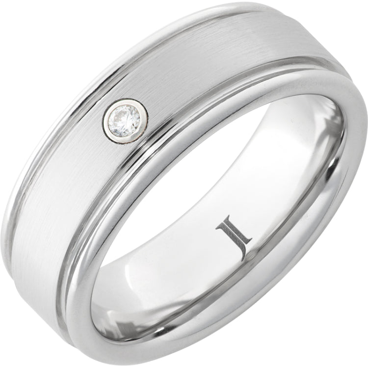 This Serinium® men's ring features a hand applied satin finish around the ring's center, with polished grooved edges for contast. A single .06 carat round diamond lends a special burst of light. Available in men's and women's sizes, with inside rounded Comfort Fit.Serinium®, the Precious Contemporary Metal®, is the finest and safest of all contemporary jewelry metals. Bright white, ultra-hard and hypoallergenic, Serinium will last a lifetime and will never tarnish or change color.