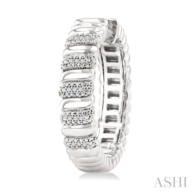 Effortlessly modern and captivating, these diamond fashion hoop earrings offer a unique blend of intricate detailing and refined elegance. The hoop earrings feature a dynamic ribbed swirl design. Plain silver ribs entwine with textured twirls that are meticulously embellished with a total of 30 prong hand set single cut diamonds, 15 on each hoop, with 3 diamonds accenting every textured twirl. The diamond fashion hoop earrings are carved in rhodium-finished silver for a sleek, contemporary look. Total diamond weight is 1/10 Ctw.