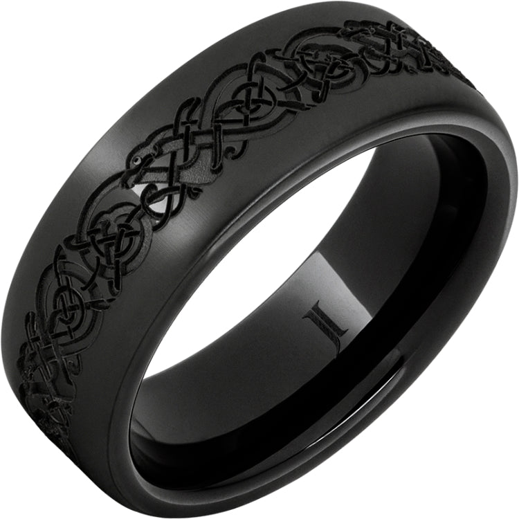 From our Cultural Heritage Collection, the Norseman ring in Black Diamond Ceramic features ancient Norse vine patterns deeply engraved around the center of the band. Also available in Serinium® and Rugged Tungsten, and in a slimmer 6mm width. Inside rounded Comfort Fit, available in men's and women's sizes.Our Cultural Heritage collection celebrates the rich cultural heritage of America. We offer a wide selection of classic ancestral patterns and religious themed rings, plus custom patterns on request, in all of our contemporary metals.